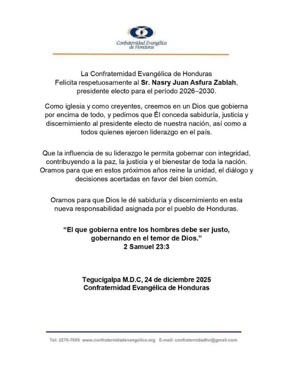 “Oramos para que Dios le dé sabiduría y discernimiento en esta nueva responsabilidad asignada por el pueblo de Honduras”, expresó la Confraternidad, al reafirmar su compromiso espiritual con la nación.
