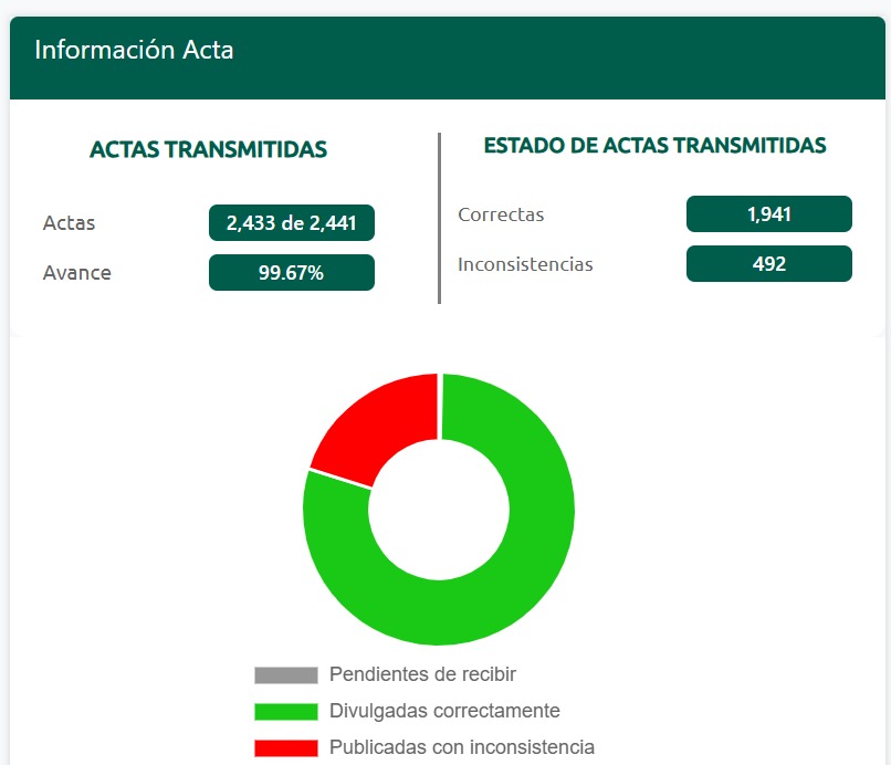 De las 2,441 actas transmitidas, el órgano electoral reporta que 2,433 han sido procesadas, lo que representa un avance del 99.67%. De estas, 1,941 actas fueron transmitidas sin problemas y 492 presentan inconsistencias que aún deben ser revisadas.