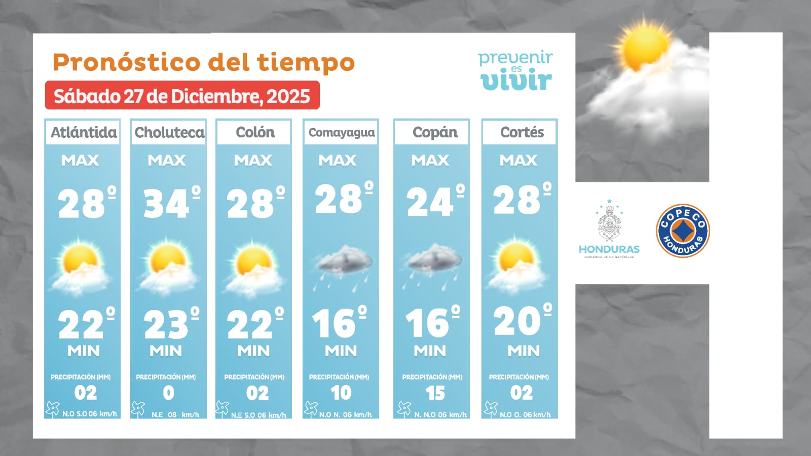 - La Ceiba: 28° como máximo, 22° como mínima (02 milímetros).