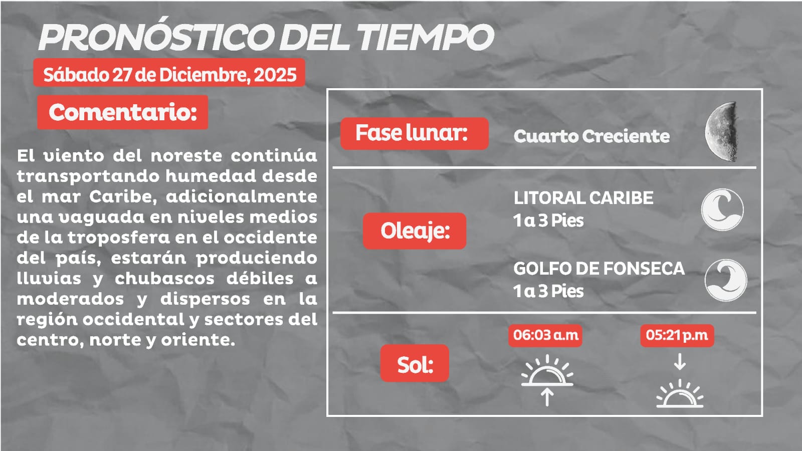 Redacción. El Centro Nacional de Estudios Atmosféricos, Oceanográficos y Sísmicos (Cenaos) emitió el pronóstico del tiempo para este sábado 27 de diciembre en el territorio nacional.
