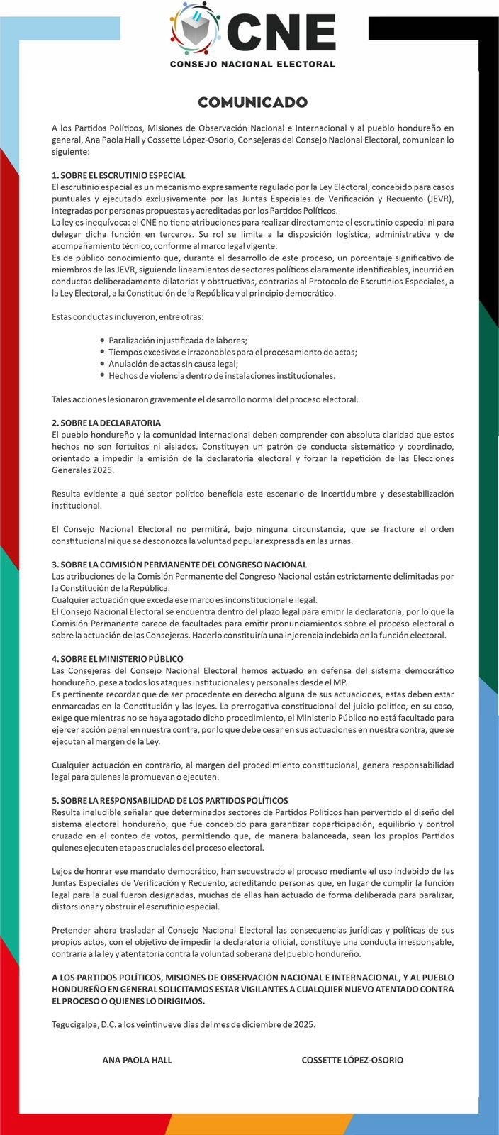 Redacción. Las consejeras del Consejo Nacional Electoral (CNE), Ana Paola Hall y Cossette López-Osorio, emitieron un comunicado en el que denuncian irregularidades durante el escrutinio especial y rechazan presiones que, aseguran, buscan impedir la declaratoria electoral.