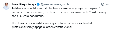 Finalmente, Juan Diego Zelaya también felicitó a la institución militar y su actual liderazgo, destacando la firmeza en la defensa de la Constitución.