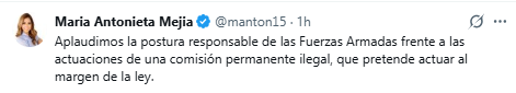 Por su parte, María Antonieta Mejía aplaudió lo que consideró una «postura responsable» de la institución castrense frente a lo que describió como «las actuaciones de una comisión ilegal».