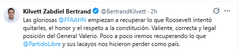 «Las gloriosas Fuerzas Armadas empiezan a recuperar lo que Roosevelt intentó quitarles: el honor y el respeto a la constitución. Poco a poco iremos recuperando lo que partido Libre y sus lacayos nos hicieron perder como país», escribió.