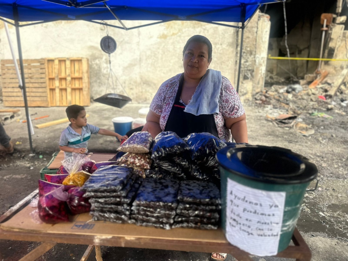 En uno de los extremos de la calle, Leslie Janeth Oseguera, vendedora de insumos para jugos naturales, ya había logrado instalar su pequeño negocio. Con ayuda de su familia y de algunos proveedores, compró una carpa, llevó mesas y colocó mercadería fiada, intentando empezar de nuevo en el mismo lugar que por años fue su sustento.