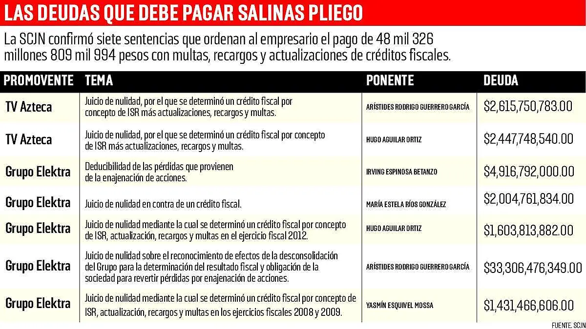 La SCJN también discutirá otros litigios de Salinas Pliego contra créditos fiscales pendientes que suman aproximadamente 48,326 millones de pesos, correspondientes a ejercicios fiscales previos.