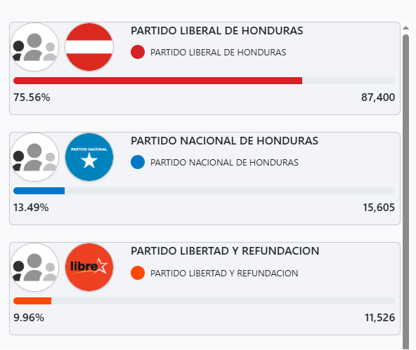 El candidato del Partido Nacional de Honduras, Yaudet Burbara, obtiene hasta el momento 15,605 votos. Por su parte, Rodolfo Padilla Sunseri, del Partido Libertad y Refundación (Libre), suma 11,526 votos.