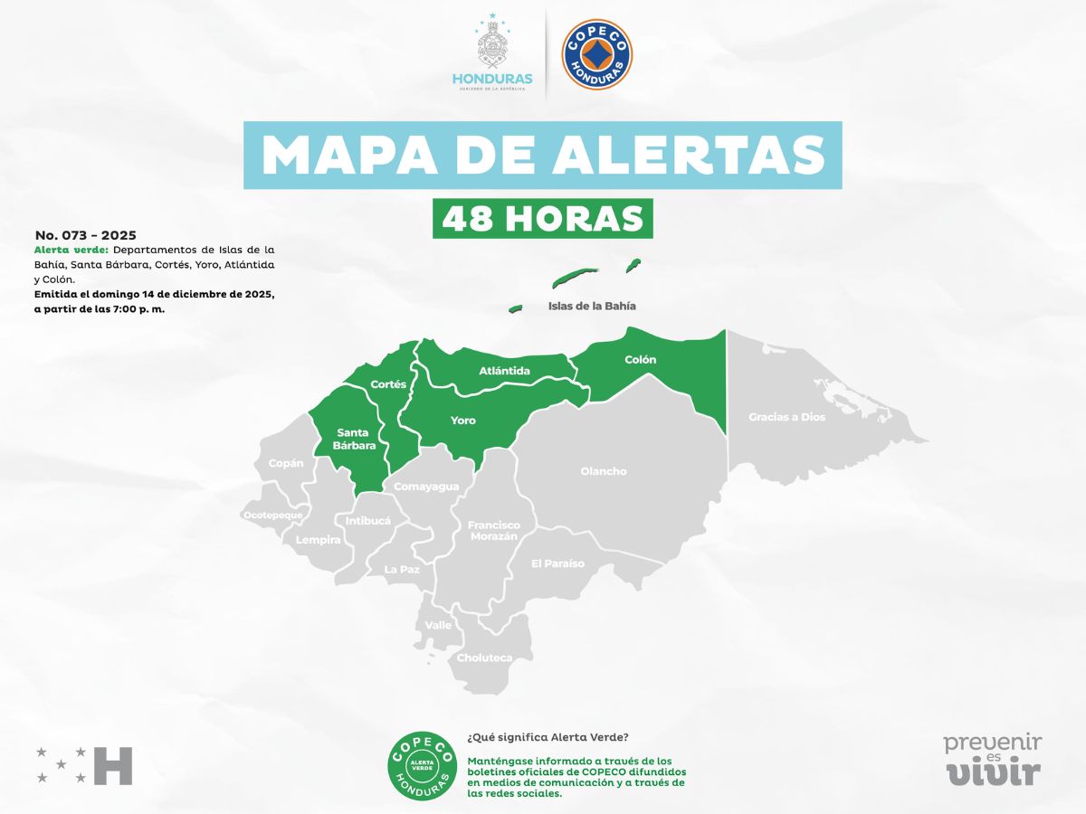 Ante estas condiciones climáticas adversas, la Secretaría de Gestión de Riesgos y Contingencias (Copeco) declaró alerta verde. La alerta aplica para Islas de la Bahía, Santa Bárbara, Cortés, Yoro, Atlántida y Colón. La medida preventiva comenzó a las 7:00 de la noche de este domingo 14 de diciembre. Tendrá una vigencia de 48 horas con el objetivo de reducir riesgos por posibles afectaciones.