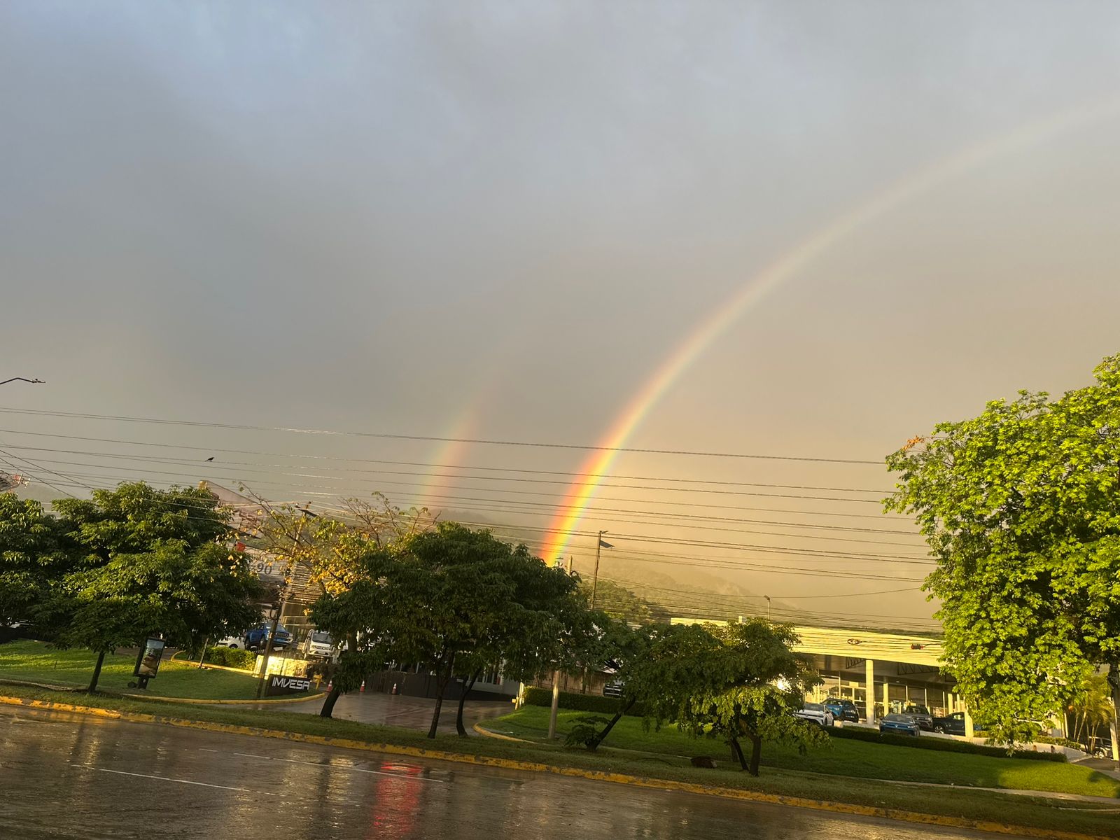 Varios peatones portan sombrillas para sortear las calles inundadas. Durante la precipitación, un arcoíris apareció en el bulevar del sur.