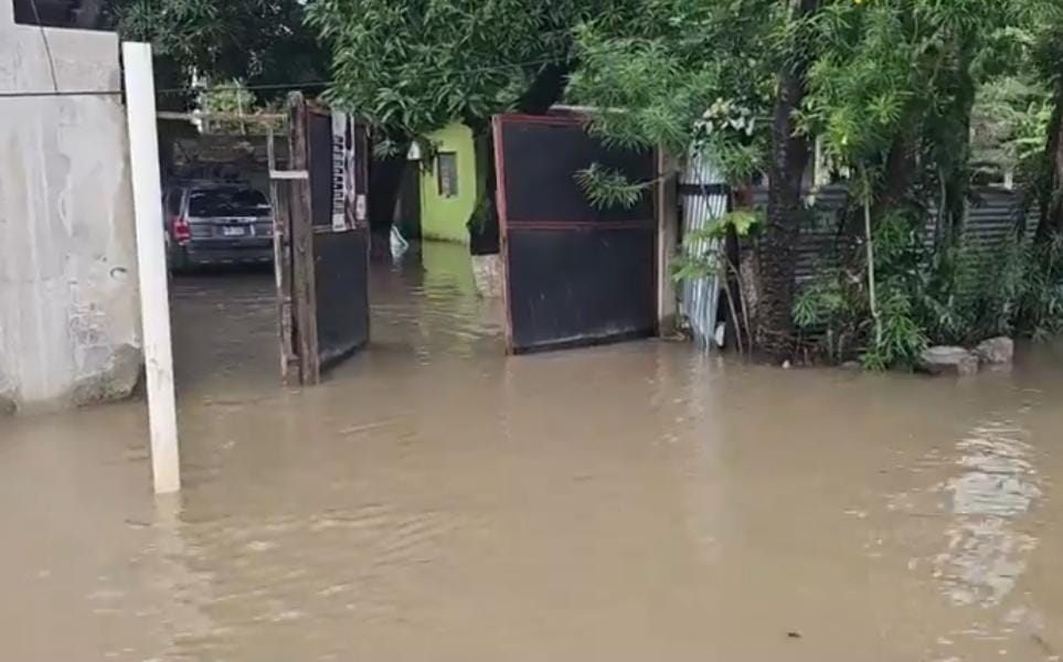 Vecinos de la colonia 6 de Mayo caminaban con agua hasta las rodillas, usando calzonetas y palos como apoyo para evitar caerse en las calles inundadas. El agua ingresó a varias casas de estructura baja, llenando completamente las viviendas.