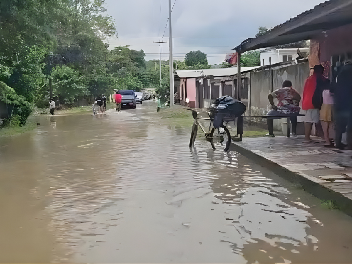 Vecinos de la colonia 6 de Mayo caminaban con agua hasta las rodillas, usando calzonetas y palos como apoyo para evitar caerse en las calles inundadas. El agua ingresó a varias casas de estructura baja, llenando completamente las viviendas.
