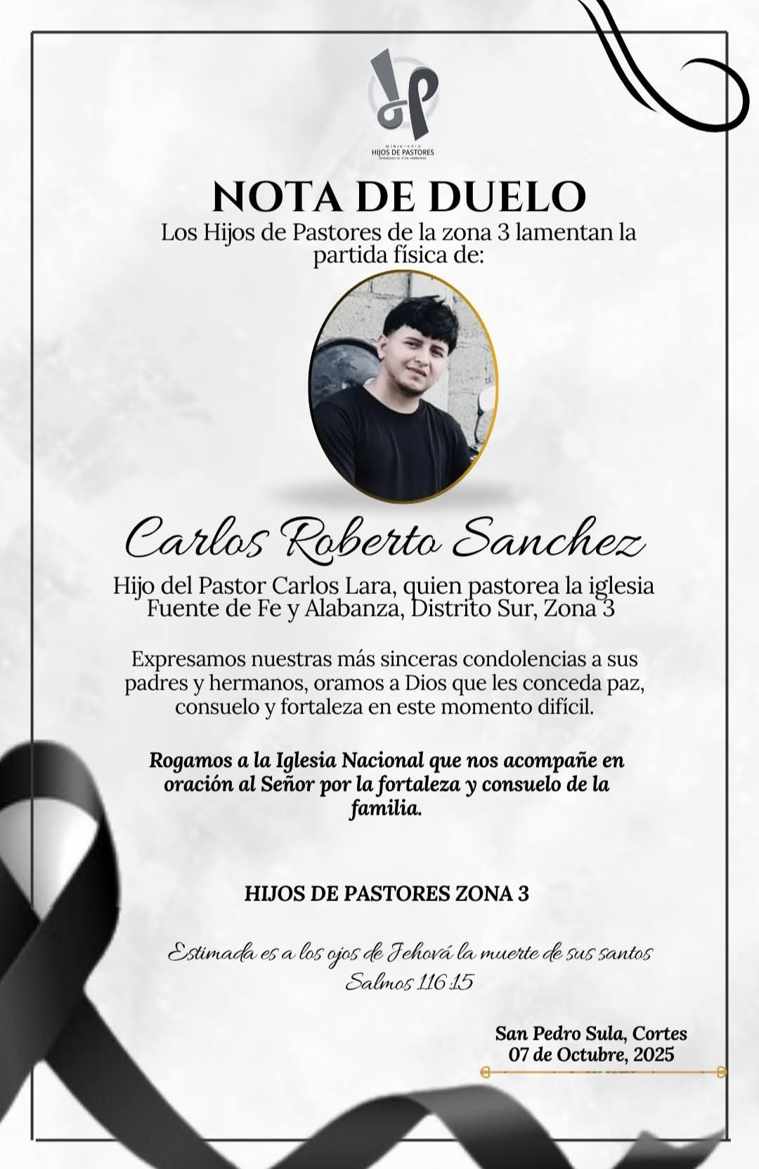 «Con profundo dolor, compartimos la partida física de nuestro amado hermano Carlos Roberto Sánchez… Como Hijos de Pastores, nos unimos en oración por su familia, rogando a Dios que les conceda consuelo, fortaleza y paz en este momento tan difícil».