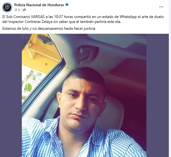 De acuerdo con la Policía Nacional, el subcomisario Vargas a las 10:37 de la mañana publicó en su estado de WhatsApp el arte de duelo por la muerte violenta del inspector Contreras Zelaya, en Olancho, sin imaginarse que él también perdería la vida en el cumplimiento del deber el mismo día.