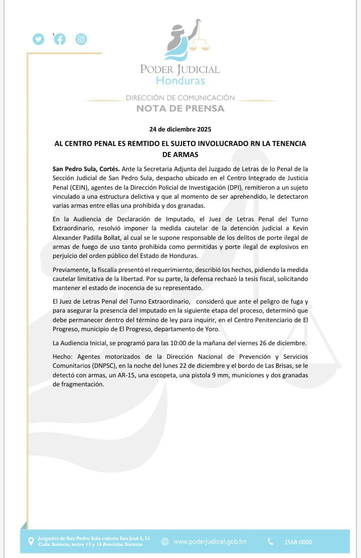 En consecuencia, ordenó que Padilla cumpla la medida en el Centro Penitenciario de El Progreso, en el municipio de El Progreso, departamento de Yoro.