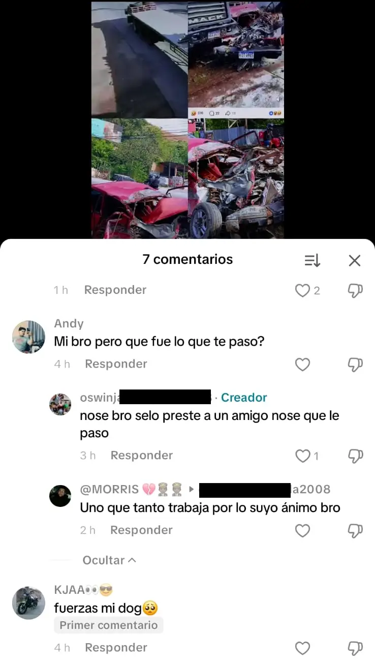 Horas después del accidente, Oswin Jahir Zepeda, propietario del vehículo, apareció en TikTok compartiendo fotos de su carro antes del incidente y mostrando cómo lucía tras el choque.